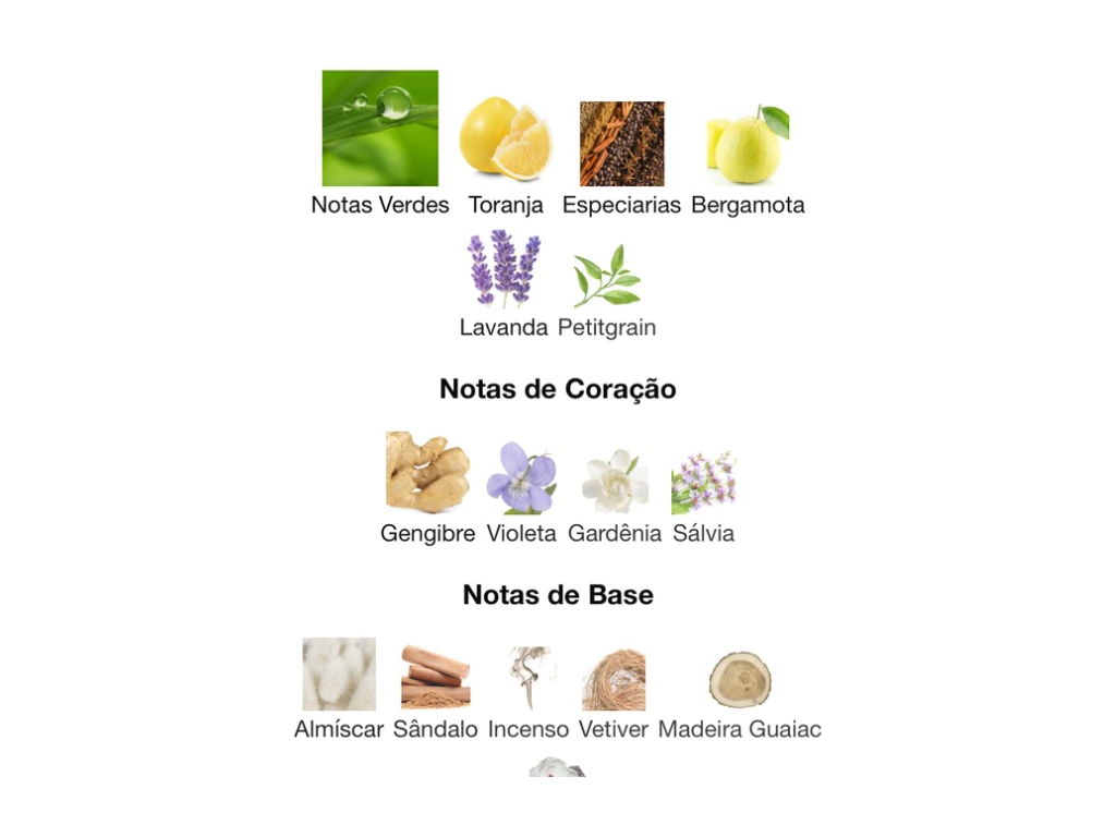 Ao abrir, você será envolvido pelas notas de topo vibrantes de notas verdes, toranja, especiarias, bergamota, lavanda e petitgrain, que proporcionam uma explosão refrescante e energética. No coração, o perfume revela seu lado mais sofisticado e envolvente com gengibre, violeta, gardênia e sálvia, conferindo um equilíbrio perfeito entre o floral e o especiado.