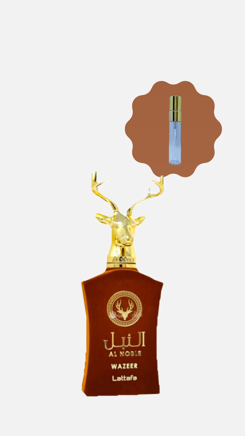 Wazeer de Lattafa Perfumes é um perfume Compartilhável. As notas de topo são: Hortelã, Laranja, Bergamota e Zimbro. As notas de coração são: Chocolate, Caramelo, Pera, Íris e Framboesa. As notas de fundo são: Âmbar, Baunilha, Sândalo, Almíscar, Cedro e Vetiver.