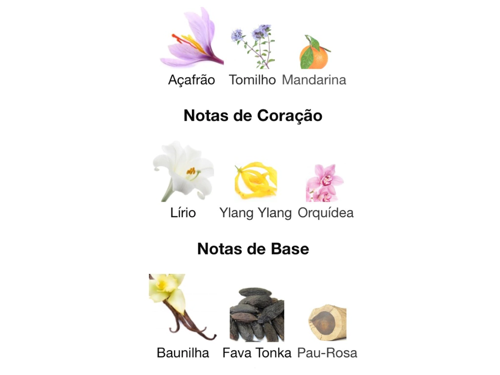 Sua composição é uma verdadeira obra-prima olfativa que combina notas sofisticadas e envolventes. As notas de topo trazem uma explosão fresca e vibrante de Açafrão, Tomilho e Mandarina, despertando os sentidos logo no primeiro contato.