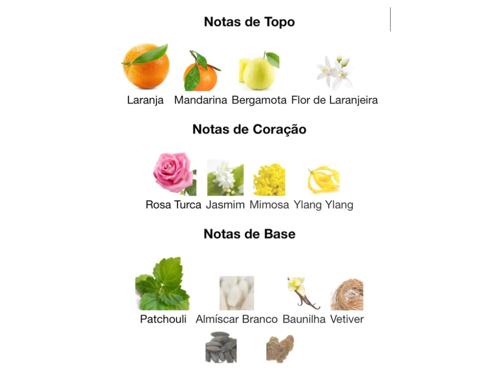 Logo nas primeiras notas, você sentirá a refrescância envolvente da Laranja, Mandarina, Bergamota e Flor de Laranjeira, que despertam os sentidos com um toque cítrico vibrante. No coração, flores delicadas como Rosa Turca, Jasmim, Mimosa e Ylang Ylang criam uma combinação floral intensa e sofisticada.