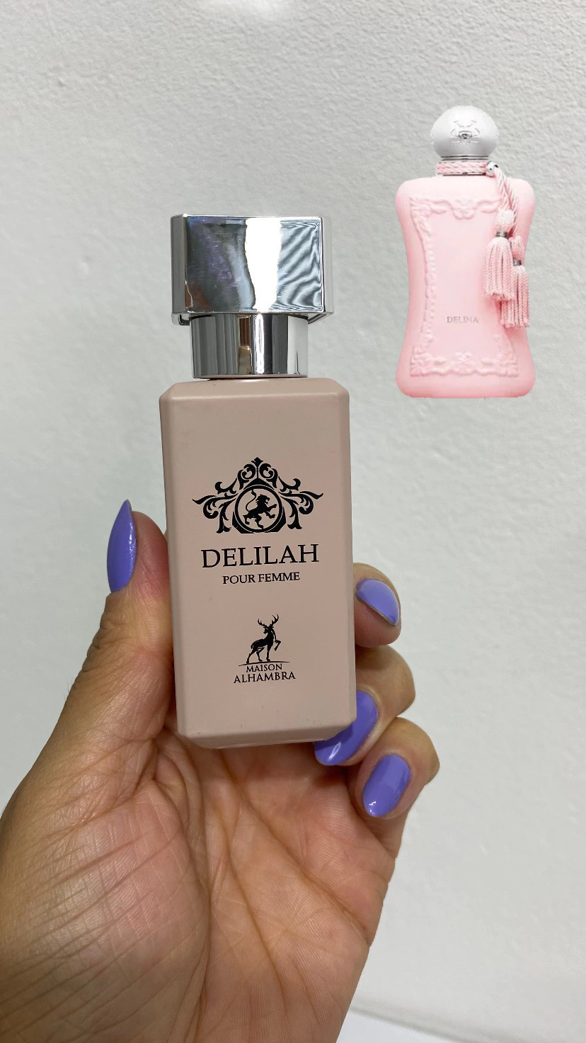 Delilah de Maison Alhambra é um perfume Floral Frutado Feminino. Delilah foi lançada em 2023. As notas de topo são: Ruibarbo, Lichia e Bergamota. As notas de coração são: Rosa Turca, Peônia e Lírio. As notas de fundo são: Almíscar Branco, Baunilha e Cashmeran.