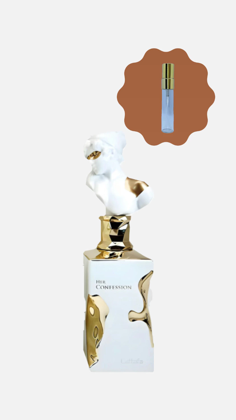 Her Confession de Lattafa Perfumes é um perfume Feminino. Esta é uma nova fragrância. Her Confessionfoi lançada em 2024. As notas de topo são: Mystikal e Canela. As notas de coração são: Tuberosa, Jasmim, Incenso e Mahonial®. As notas de fundo são: Baunilha, Almíscar e Fava Tonka.