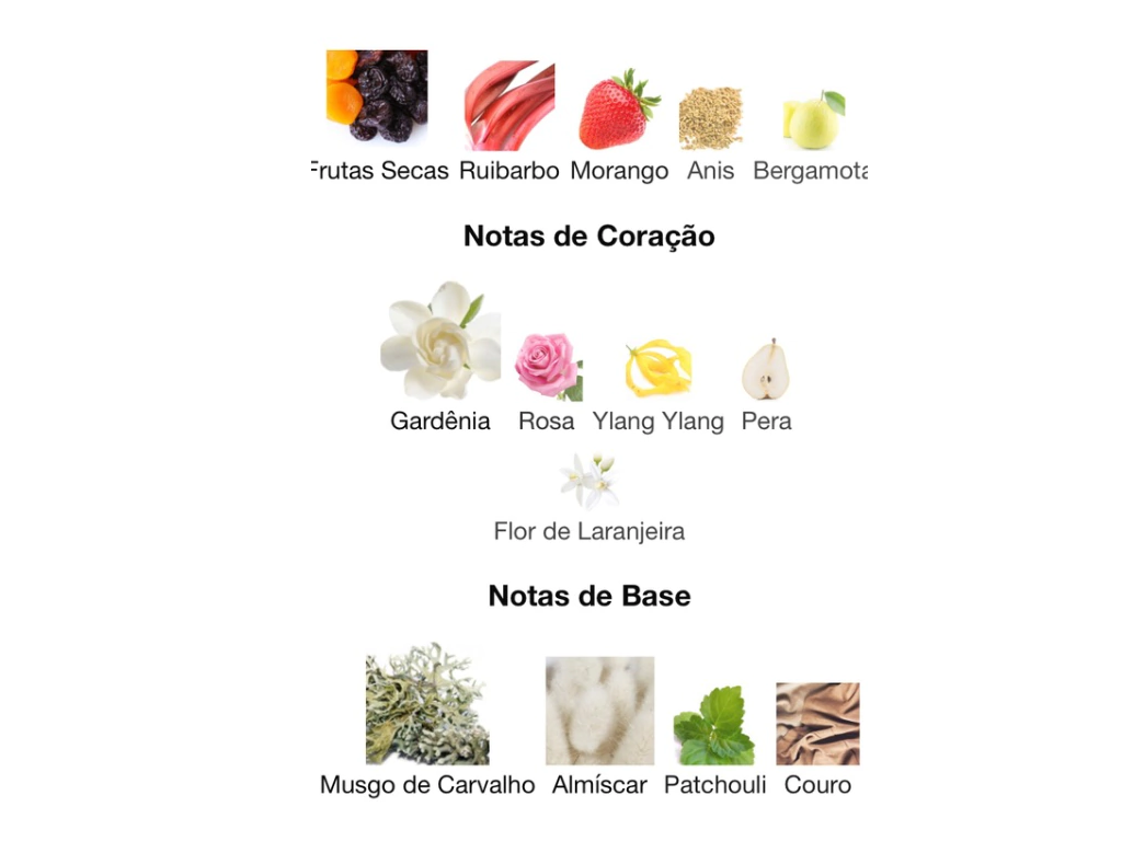 Logo nas notas de topo, você sente a combinação envolvente de Frutas Secas, Ruibarbo, Morango, Anis e Bergamota, que despertam os sentidos com um frescor frutado e cítrico. No coração, as flores ganham destaque com a presença de Gardênia, Rosa, Ylang Ylang, Pera e Flor de Laranjeira, criando um bouquet floral rico e encantador. A base traz a intensidade e o charme do Musgo de Carvalho, Almíscar, Patchouli e Couro, conferindo uma fixação duradoura e um rastro inesquecível.