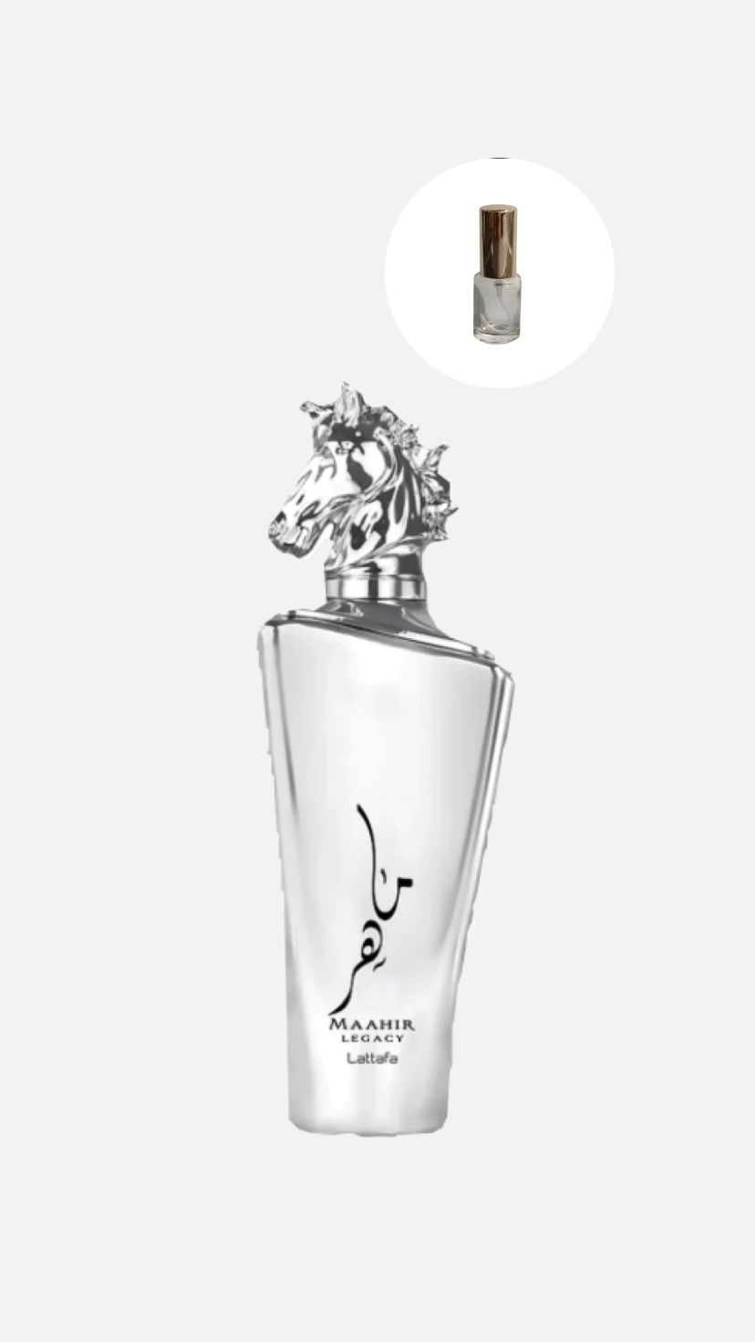 Maahir Legacy de Lattafa Perfumes é um perfume Masculino. As notas de topo são: Lima, Hortelã, Toranja, Lavanda e Abacaxi. As notas de coração são: Pimenta Preta, Bagas de Zimbro, Alecrim, Gerânio e Olíbano. As notas de fundo são: Ambroxan, Vetiver, Musgo de Carvalho, Fava Tonka e Cashmeran.