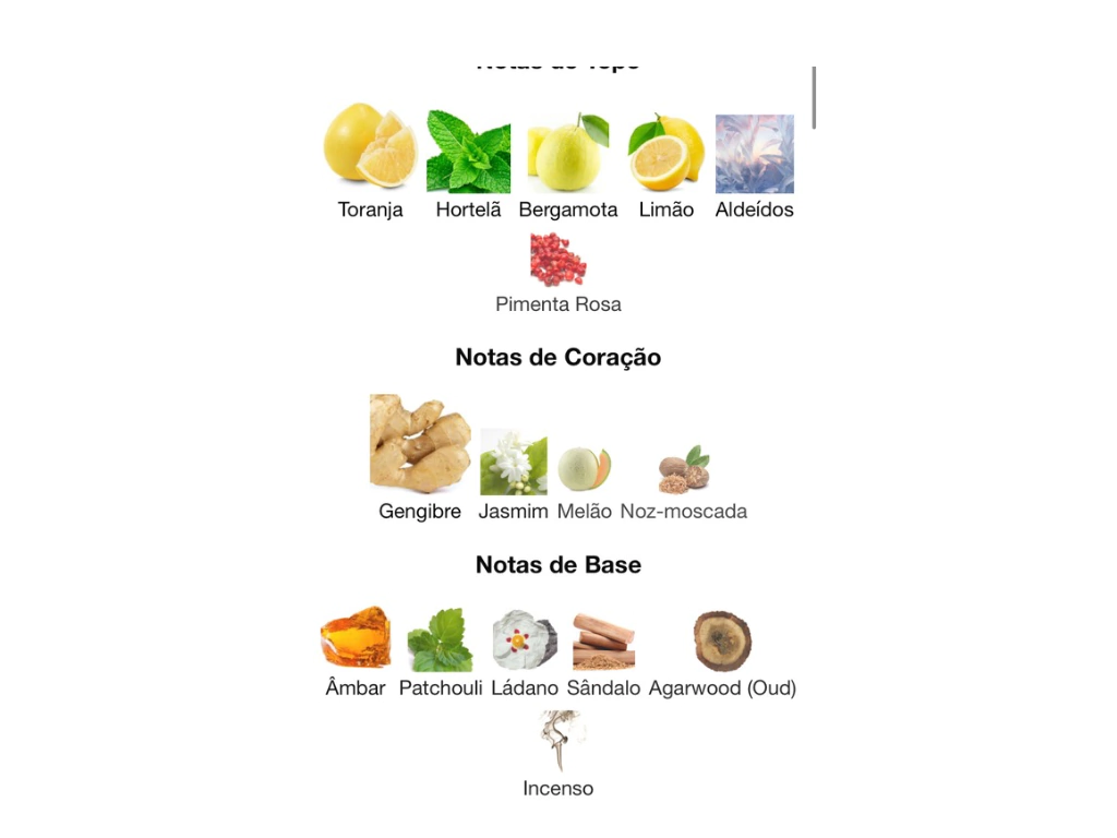 As notas de topo trazem uma explosão refrescante e vibrante com toranja, hortelã, bergamota, limão, aldeídos e pimenta rosa, despertando os sentidos logo ao primeiro contato.
