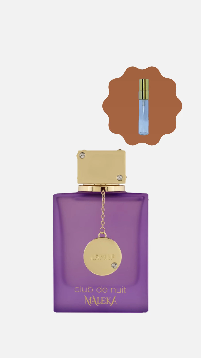 Maleka é um perfume Floral Frutado Feminino. Esta é uma nova fragrância. Club De Nuit Maleka foi lançada em 2025. O perfumista que assina esta fragrância é Olivier Cresp. As notas de topo são: Lichia, Bergamota e Pimenta Rosa. A nota de coração é Raíz de Orris. As notas de fundo são: Pralinê, Sândalo e Ambroxan.