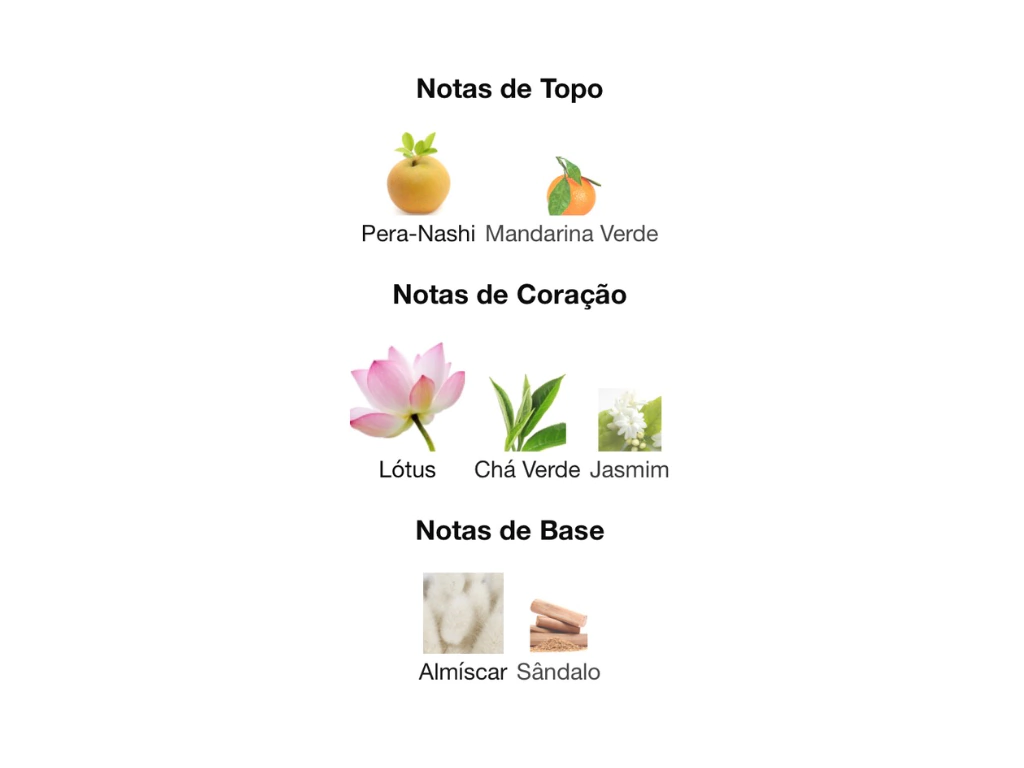 Logo nas notas de topo, a refrescante combinação de Pera-Nashi e Mandarina Verde desperta os sentidos com uma explosão frutada e vibrante. No coração, a suavidade do Lótus, o frescor do Chá Verde e a elegância do Jasmim criam um bouquet floral envolvente e delicado. Para finalizar, as notas de fundo de Almíscar e Sândalo garantem uma base quente, sofisticada e de longa duração.