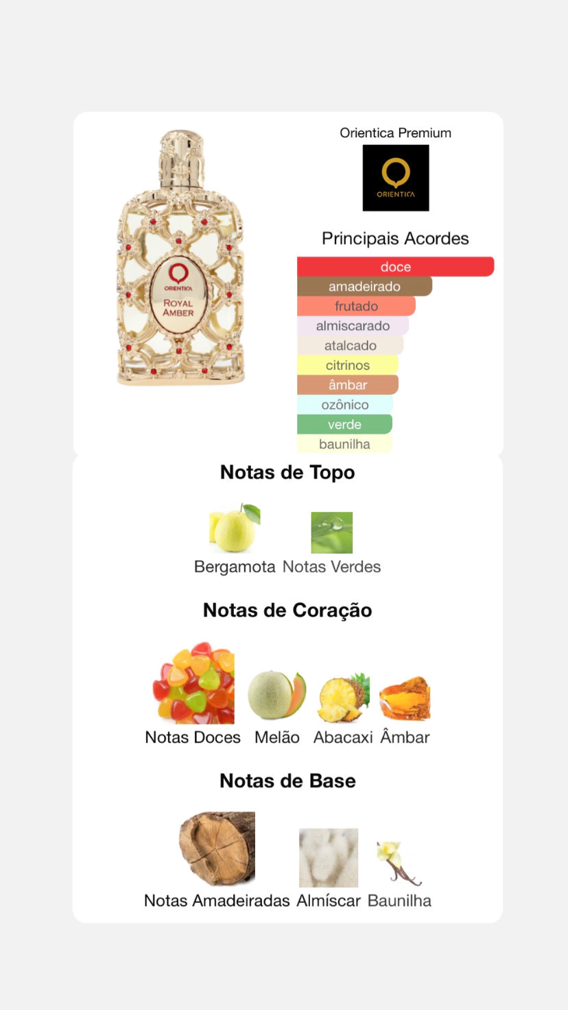 Na base, as notas amadeiradas, almíscar e baunilha criam um rastro marcante e duradouro, destacando a personalidade única do Royal Amber Oriêntica.