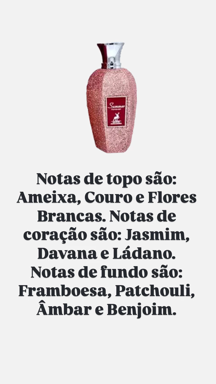 Notas de fundo são: Framboesa, Patchouli, Âmbar e Benjoim.