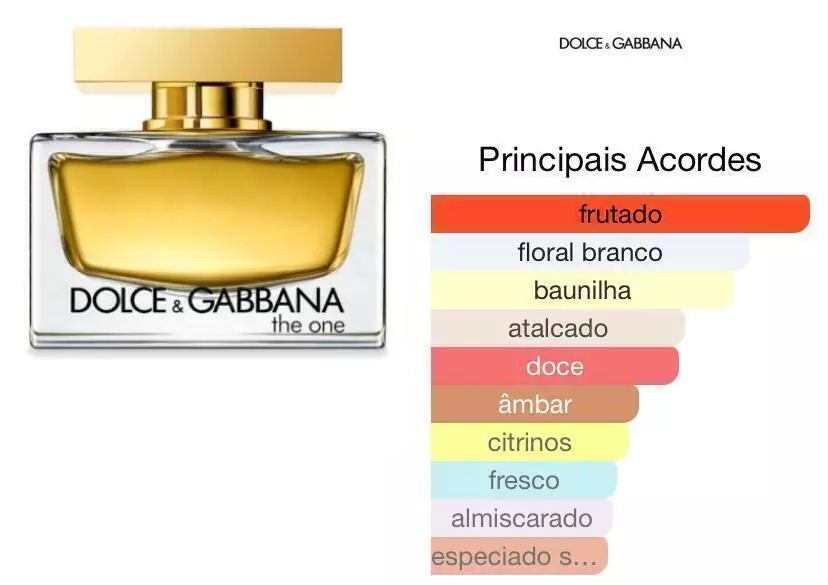 The One de Dolce&Gabbana é um perfume Oriental Floral Feminino. The One foi lançada em 2006. O perfumista que assina esta fragrância é Christine Nagel. As notas de topo são: Pêssego, Lichia, Mandarina e Bergamota. As notas de coração são: Lírio, Ameixa, Jasmim e Lírio-do-Vale. As notas de fundo são: Baunilha, Âmbar, Almíscar e Vetiver.